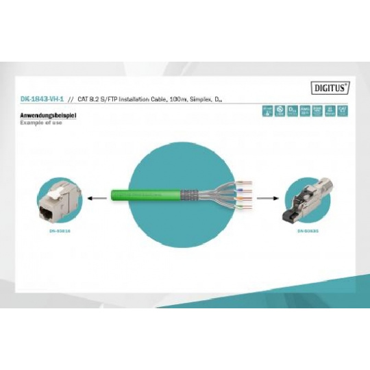Instalační kabel DIGITUS® Professional CAT 8.2 S/FTP je vybaven následující strukturou kabelu 4x2x AWG22/1 a dosahuje přenosové frekvence až 2000 MHz. Bezhalogenový kabelový plášť splňuje normy IEC 60332-3-24, FRNC-C, LSZH-3 a CPR Euro třídy DCA Kabel je vhodný pro stavbu kabeláže v sekundárních a terciárních oblastech. Splňuje následující normy ISO/IEC 11801, DIN EN 50173, DIN EN 50288-12-1.