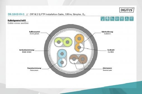 Instalační kabel DIGITUS® Professional CAT 8.2 S/FTP je vybaven následující strukturou kabelu 4x2x AWG22/1 a dosahuje přenosové frekvence až 2000 MHz. Bezhalogenový kabelový plášť splňuje normy IEC 60332-3-24, FRNC-C, LSZH-3 a CPR Euro třídy DCA Kabel je vhodný pro stavbu kabeláže v sekundárních a terciárních oblastech. Splňuje následující normy ISO/IEC 11801, DIN EN 50173, DIN EN 50288-12-1.