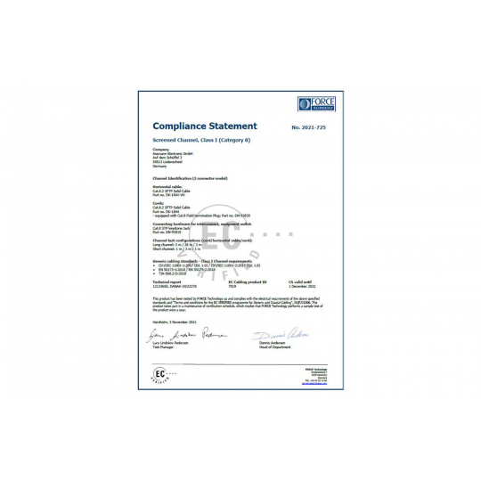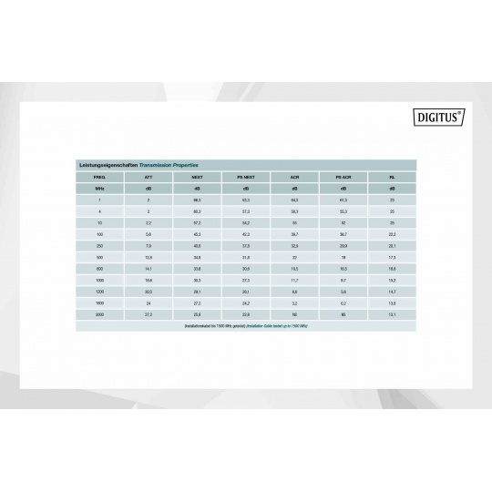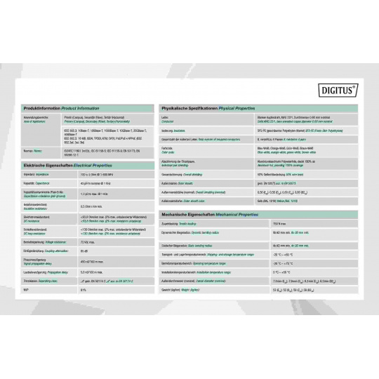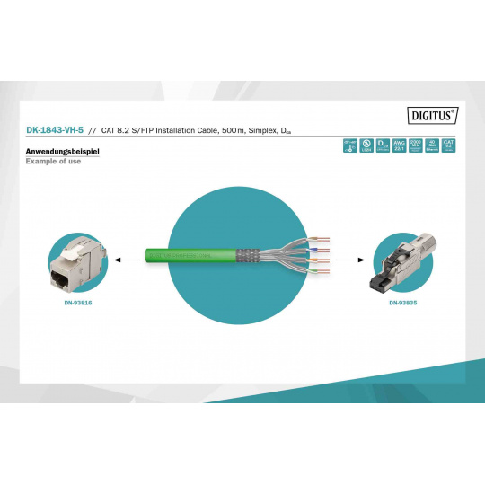 Instalační kabel DIGITUS® Professional CAT 8.2 S/FTP má následující strukturu kabelu 4x2x AWG22/1 a dosahuje přenosové frekvence až 2000 MHz. Bezhalogenový plášť kabelu splňuje normy IEC 60332-3-24, FRNC-C, LSZH-3 a CPR Euro třídy DCA Kabel je vhodný pro kabeláž budov v sekundárních a terciárních oblastech. Splňuje následující normy ISO/IEC 11801, DIN EN 50173, DIN EN 50288-12-1.