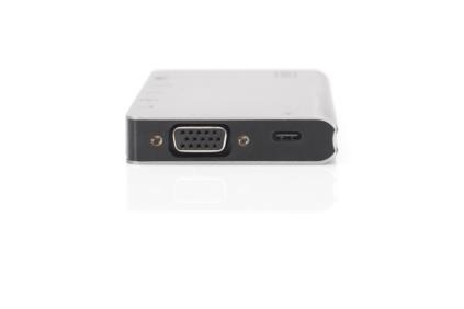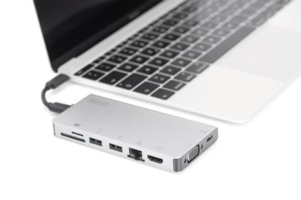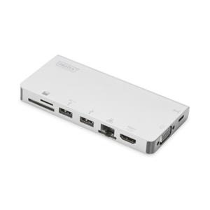 Digitus Cestovní dokovací stanice USB-C Multiport, 8 portů 2x video, 2x USB-C, 2x USB3.0, čtečka karet RJ45,2x