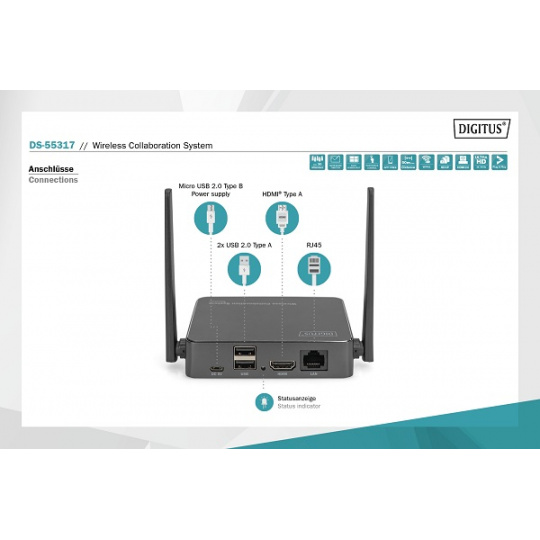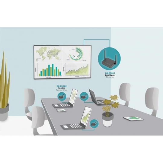 Bezdrátový systém pro spolupráci od společnosti DIGITUS® spojuje všechna vaše zařízení (notebook, tablet, chytrý telefon) a nabízí hardwarové prezentační řešení pro bezdrátový přenos obsahu obrazovky pro zasedací a konferenční místnosti. K přijímači lze připojit až 30 účastníků. Až 4 účastníci mohou prezentovat/spolupracovat současně v režimu rozdělené obrazovky. Notebooky lze připojit pomocí vysílače HDMI, sadu lze rozšířit o další vysílače (DS-55322). Sdílejte obsah pohodlně z tabletu/smartphonu pomocí funkce sdílení/vysílání (iOS/Android) mobilního zařízení, k tomu nejprve propojte mobilní zařízení s přijímačem (SSID) prostřednictvím sítě WLAN. Konfigurace systému je zde optimálně zjednodušena - není zapotřebí žádný další software/aplikace. Zvyšte efektivitu svých schůzek, ušetřete čas a dosáhněte optimálních výsledků. Sdílejte - prezentujte - spolupracujte.