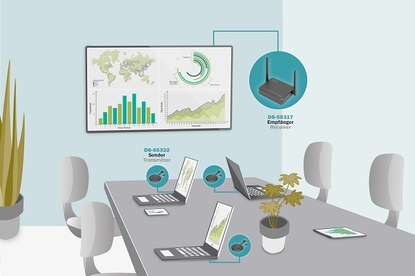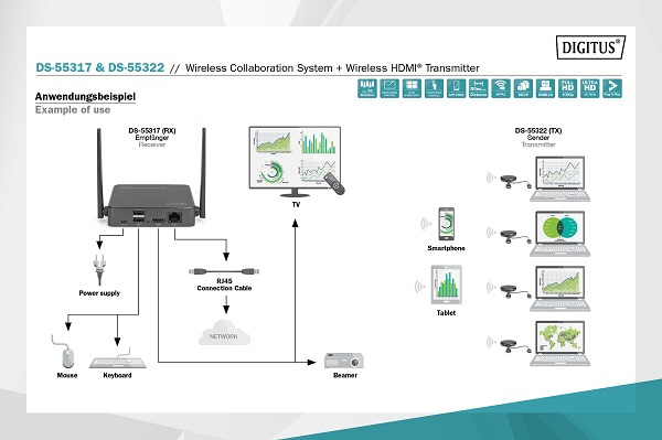 Bezdrátový systém pro spolupráci od společnosti DIGITUS® spojuje všechna vaše zařízení (notebook, tablet, chytrý telefon) a nabízí hardwarové prezentační řešení pro bezdrátový přenos obsahu obrazovky pro zasedací a konferenční místnosti. K přijímači lze připojit až 30 účastníků. Až 4 účastníci mohou prezentovat/spolupracovat současně v režimu rozdělené obrazovky. Notebooky lze připojit pomocí vysílače HDMI, sadu lze rozšířit o další vysílače (DS-55322). Sdílejte obsah pohodlně z tabletu/smartphonu pomocí funkce sdílení/vysílání (iOS/Android) mobilního zařízení, k tomu nejprve propojte mobilní zařízení s přijímačem (SSID) prostřednictvím sítě WLAN. Konfigurace systému je zde optimálně zjednodušena - není zapotřebí žádný další software/aplikace. Zvyšte efektivitu svých schůzek, ušetřete čas a dosáhněte optimálních výsledků. Sdílejte - prezentujte - spolupracujte.