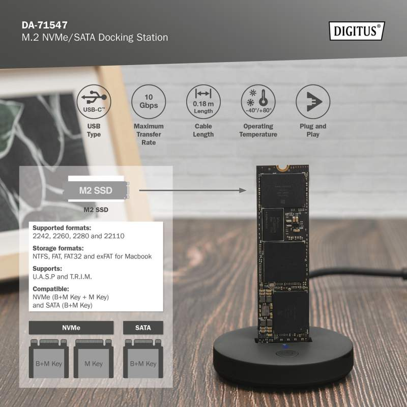 Dokovací stanice SSD od společnosti DIGITUS® pojme M.2 SSD v technologii NVMe nebo SATA s kapacitou až 4 TB. Podporuje NVMe SSD s B+M Key & M-Key a SATA SSD s B+M-Key, každý ve formátech 2242, 2260, 2280 a 22110. Snadno rozšiřte úložnou kapacitu mnoha USB-C™ zařízení, jako jsou PC, notebooky, televizory, herní konzole nebo routery.