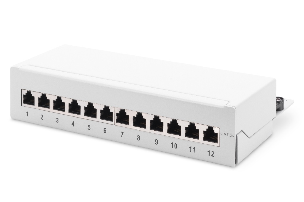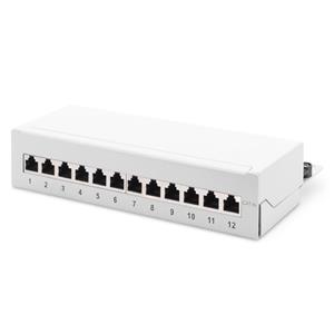 DIGITUS Desktop CAT 6A, patch panel, stíněné třídy EA, 12 portů RJ45, 8P8C, LSA, šedá RAL 7035