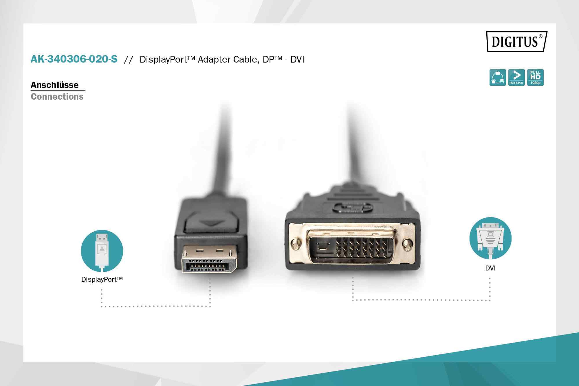Tento digitální HD kabel převádí signály DisplayPort na signály DVI a je ideální pro připojení zařízení DisplayPort k televizoru HD, projektoru nebo monitoru s rozhraním DVI.