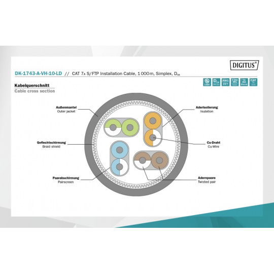 Instalační kabel Digitus CAT 7A je určen pro použití ve strukturovaných datových centrech a kabeláži budov podle ISO/IEC 11801, DIN EN 50288-4-1, DIN EN 50173, IEC 61156-7, EN 50288-9-1. Kabel je dokonale vhodný pro přenos analogových i digitálních dat a podporuje také POE a POE+. Konstrukce stínění je složena z jednotlivých stíněných párů s pocínovaným měděným opředením, které zajišťuje vynikající stínění a elektrické hodnoty.