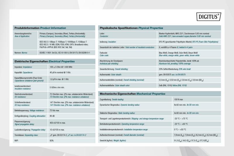 Instalační kabel Digitus CAT 7A je určen pro použití ve strukturovaných datových centrech a kabeláži budov podle ISO/IEC 11801, DIN EN 50288-4-1, DIN EN 50173, IEC 61156-7, EN 50288-9-1. Kabel je dokonale vhodný pro přenos analogových i digitálních dat a podporuje také POE a POE+. Konstrukce stínění je složena z jednotlivých stíněných párů s pocínovaným měděným opředením, které zajišťuje vynikající stínění a elektrické hodnoty.