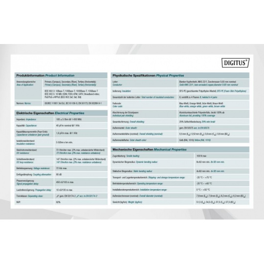 Instalační kabel Digitus CAT 7A je určen pro použití ve strukturovaných datových centrech a kabeláži budov podle ISO/IEC 11801, DIN EN 50288-4-1, DIN EN 50173, IEC 61156-7, EN 50288-9-1. Kabel je dokonale vhodný pro přenos analogových i digitálních dat a podporuje také POE a POE+. Konstrukce stínění je složena z jednotlivých stíněných párů s pocínovaným měděným opředením, které zajišťuje vynikající stínění a elektrické hodnoty.