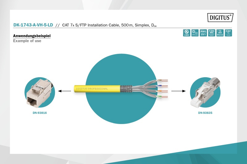 Instalační kabel Digitus CAT 7A je určen pro použití ve strukturovaných datových centrech a kabeláži budov podle ISO/IEC 11801, DIN EN 50288-4-1, DIN EN 50173, IEC 61156-7, EN 50288-9-1. Kabel je dokonale vhodný pro přenos analogových i digitálních dat a podporuje také POE a POE+. Konstrukce stínění je složena z jednotlivých stíněných párů s pocínovaným měděným opředením, které zajišťuje vynikající stínění a elektrické hodnoty.