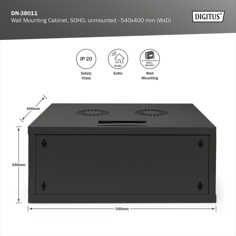 DIGITUS DN-38011 Nástěnná skříň 4U, SOHO, nemontovaná 241x540x400 mm, celoskleněné přední dveře, černá (RAL 9005)