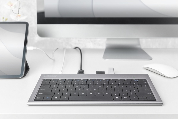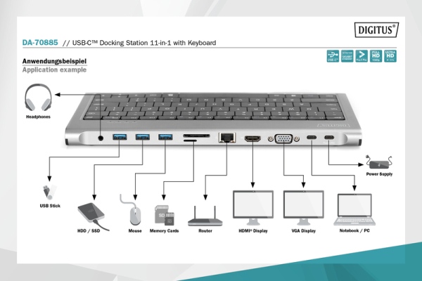 Multifunkční dokovací stanice DIGITUS® má vše, co potřebujete k vytvoření plně vybaveného pracoviště. Integrovaná klávesnice umožňuje ještě pohodlnější využití notebooku nebo MacBook®, a to ve spojení s dokovací stanicí. Prostřednictvím portu HDMI® a VGA můžete svou plochu rozšířit o 2 další monitory nebo připojit projektory / televizní zařízení. V kombinaci s vaší stávající obrazovkou vám to umožní klonovat plochu nebo ji rozšířit na maximálně 3 displeje (Windows: 3 rozšířeno / macOS®: 2 rozšířeno + 1 klonováno). Dokovací stanice je navíc vybavena dvěma porty USB-C ™, z nichž jeden je vybaven funkcí Power Delivery (PD). To vám umožní nabíjet připojený notebook / tablet během používání. Tři další porty USB 3.0 vám poskytují dostatek místa pro připojení dalších mobilních zařízení, které lze nabíjet během používání. Samozřejmě, další USB periferní zařízení, např. Myš nebo USB flash disk, lze také připojit pomocí USB 3.0 portu (dolů kompatibilní s USB 2.0). Integrovány jsou také dva čtečky karet pro karty SD / TF a MicroSD, stejně jako gigabitový ethernetový port. To vám umožní připojit notebook k místní síti nebo k internetu pomocí dokovací stanice pomocí síťového kabelu. Funkce Desktop-Multi-Tool jsou doplněny stereofonním zvukovým konektorem. To vám umožní používat mikrofon, reproduktor nebo sluchátka. Díky multifunkční dokovací stanici DIGITUS® a integrované klávesnici můžete rozšířit možnosti notebooku, MacBook® nebo PC. Integrovány jsou také dva čtečky karet pro karty SD / TF a MicroSD, stejně jako gigabitový ethernetový port. To vám umožní připojit notebook k místní síti nebo k internetu pomocí dokovací stanice pomocí síťového kabelu. Funkce Desktop-Multi-Tool jsou doplněny stereofonním zvukovým konektorem. To vám umožní používat mikrofon, reproduktor nebo sluchátka. Díky multifunkční dokovací stanici DIGITUS® a integrované klávesnici můžete rozšířit možnosti notebooku, MacBook® nebo PC. Integrovány jsou také dva čtečky karet pro karty SD / TF a MicroSD, stejně jako gigabitový ethernetový port. To vám umožní připojit notebook k místní síti nebo k internetu pomocí dokovací stanice pomocí síťového kabelu. Funkce Desktop-Multi-Tool jsou doplněny stereofonním zvukovým konektorem. To vám umožní používat mikrofon, reproduktor nebo sluchátka. Díky multifunkční dokovací stanici DIGITUS® a integrované klávesnici můžete rozšířit možnosti notebooku, MacBook® nebo PC.
