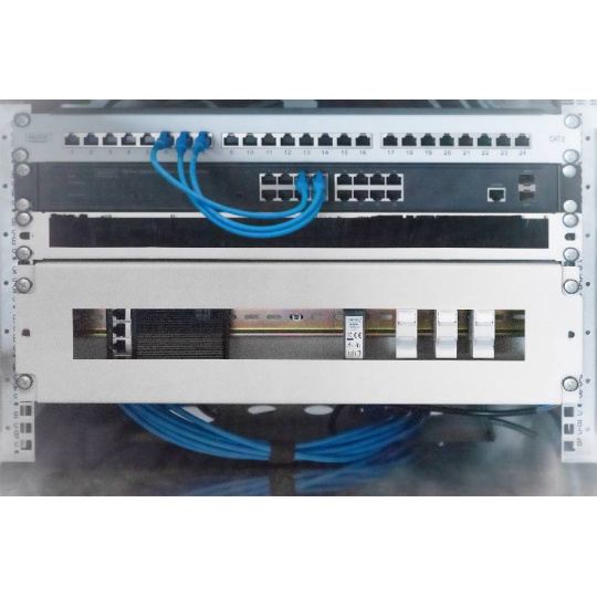 Digitus Držák na lištu DIN s krytem, 2U, 128 x 483 x 61 mm včetně lišty DIN, šedý (RAL 7035)