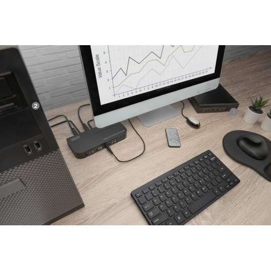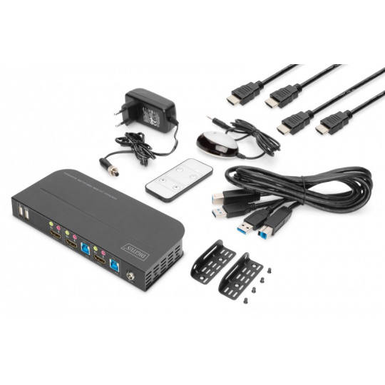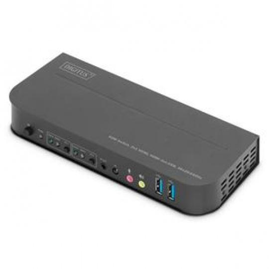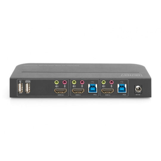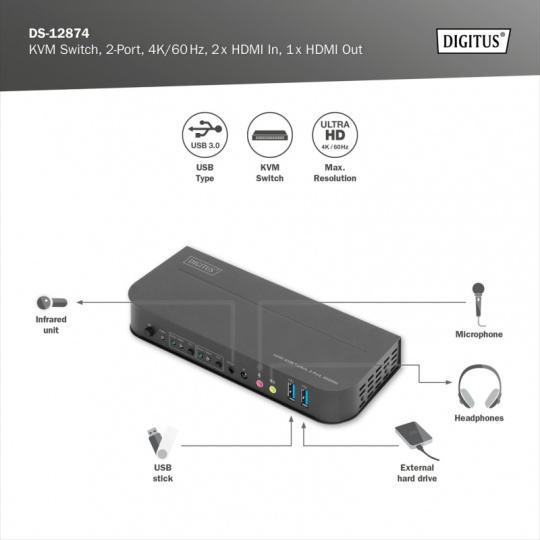 DIGITUS® 2-Port KVM Switch je vysoce výkonný HDMI-KVM přepínač. Směruje video s vysokým rozlišením (ve více rozlišeních až do 4kx2k@60Hz) a zvuk z kteréhokoli z několika zdrojů do zobrazovacích jednotek. Tento přepínač HDMI-KVM má nejen funkci přepínání stisknutím tlačítka, ale má také inteligentní funkci a také funkci připojitelnou za provozu.