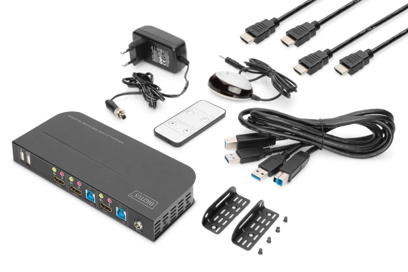 DIGITUS® 2-Port KVM Switch je vysoce výkonný HDMI-KVM přepínač. Směruje video s vysokým rozlišením (ve více rozlišeních až do 4kx2k@60Hz) a zvuk z kteréhokoli z několika zdrojů do zobrazovacích jednotek. Tento přepínač HDMI-KVM má nejen funkci přepínání stisknutím tlačítka, ale má také inteligentní funkci a také funkci připojitelnou za provozu.