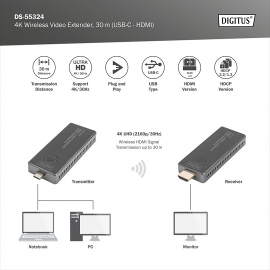 DIGITUS DS-55324 4K Wireless Video Extender Set, 30 m (USB-C - HDMI)