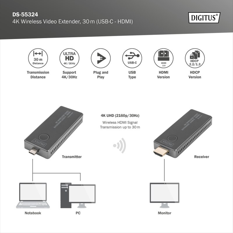 DIGITUS DS-55324 4K Wireless Video Extender Set, 30 m (USB-C - HDMI)