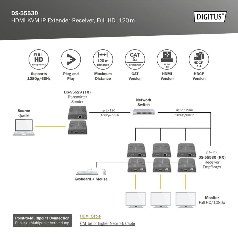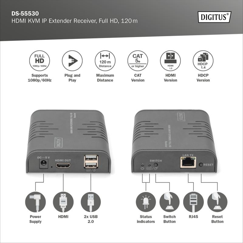 DIGITUS DS-55530 HDMI KVM IP Extender přijímač, Full HD, 60 Hz, 120m, černá