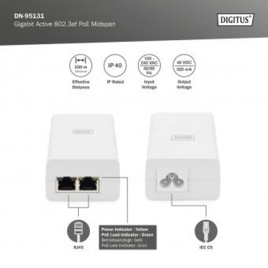 DN-95131 je vnitřní jmenovitý aktivní PoE injektor středního rozpětí speciálně navržený pro komplexní páteřní a síťové aplikace. Poskytuje napájení 48 V DC, 0,32 A pro vzdálené PD přes výstup 2 párů. Podporuje zařízení 10/100 Base-T i Gigabit. Funguje pro 15,4W PoE PD, jako jsou bezdrátové přístupové body, směrovače WLAN, síťové kamery, IP telefony, mikrovlnné rádio a další napájecí ethernetové terminály. Plně vyhovuje standardu IEEE802.3af PoE. Uzavřeno v plastovém pouzdře zpomalujícím hoření IP40. Pracuje s širokým vstupním napětím 100-240 VAC, 50 nebo 60 Hz. Má uvnitř detekční čip, který detekuje a klasifikuje PD před jeho napájením. Nebude poskytovat energii, dokud nebude detekován PD vyhovující standardu.