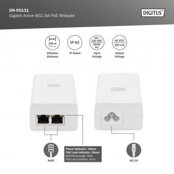 DN-95131 je vnitřní jmenovitý aktivní PoE injektor středního rozpětí speciálně navržený pro komplexní páteřní a síťové aplikace. Poskytuje napájení 48 V DC, 0,32 A pro vzdálené PD přes výstup 2 párů. Podporuje zařízení 10/100 Base-T i Gigabit. Funguje pro 15,4W PoE PD, jako jsou bezdrátové přístupové body, směrovače WLAN, síťové kamery, IP telefony, mikrovlnné rádio a další napájecí ethernetové terminály. Plně vyhovuje standardu IEEE802.3af PoE. Uzavřeno v plastovém pouzdře zpomalujícím hoření IP40. Pracuje s širokým vstupním napětím 100-240 VAC, 50 nebo 60 Hz. Má uvnitř detekční čip, který detekuje a klasifikuje PD před jeho napájením. Nebude poskytovat energii, dokud nebude detekován PD vyhovující standardu.