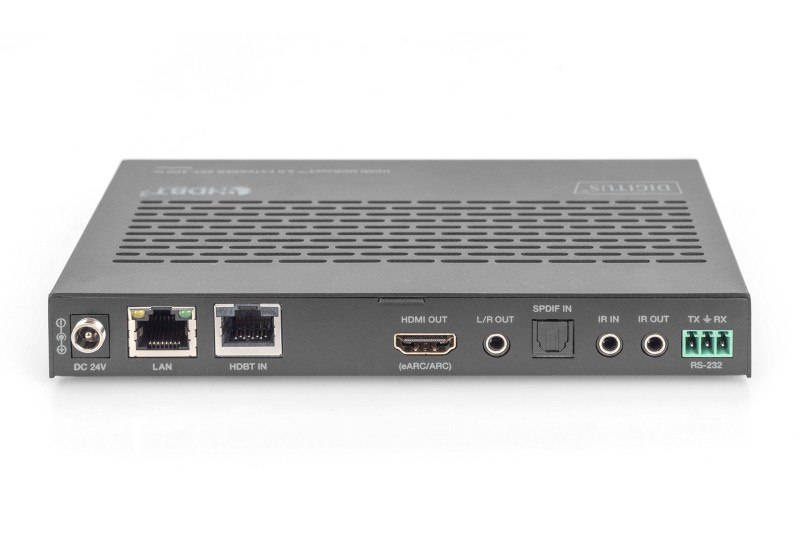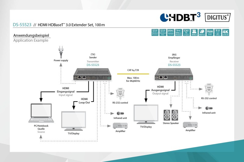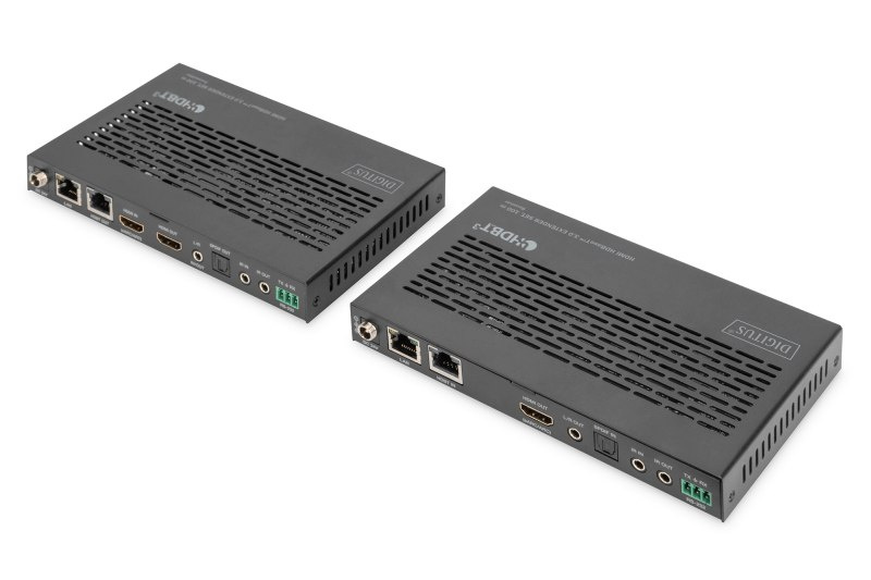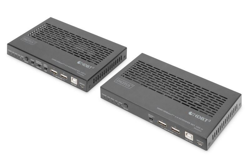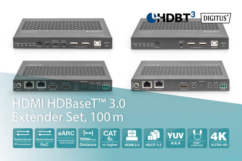 Sada extenderu DIGITUS® HDMI HDBaseT™ 3.0 umožňuje přenos nekomprimovaného AV signálu v rozlišení 4K/60Hz, 4:4:4 při 18 GB/s na vzdálenost 100 m prostřednictvím kabelů CAT 6A (nebo vyšších). Jak na vysílači, tak na přijímači jsou dva porty USB-A "Device" a také připojení USB-B "Host". To umožňuje integrovat signály USB, např. pro KVM, datové nosiče USB atd., na obou koncích a připojit je k počítači provádějícímu zpracování na příslušném opačném konci. Obě zařízení lze přepínat mezi režimem "Host" a "Device" pomocí DIP přepínače. Systém umožňuje obousměrný přenos PoC (Power over Cable) a IR. Přes RS232 lze obě zařízení ovládat samostatně. K dispozici je také oddělení analogového stereofonního zvuku. Další působivou funkcí je všestranná kompatibilita eARC/ARC, která umožňuje připojení k novým i starším audio zařízením, jako jsou AVR (Audio Video Receiver). K dispozici jsou zde dva režimy (ARC, S/PDIF), které lze také velmi snadno přepínat pomocí přepínacího přepínače.