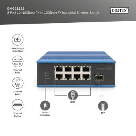 DIGITUS Industrial 8+1 Port Fast Ethernet Switch Unmanaged, 8 RJ45 Ports 10/100 Mbits