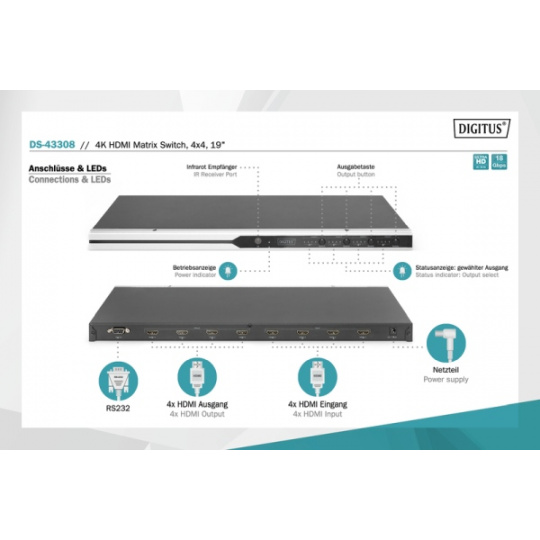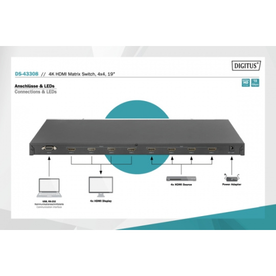 DIGITUS Maticový přepínač 4x4 HDMI 2.0, 19 palců 4K/60Hz, stříbrný/černý