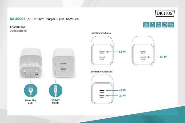 Dual Port Charging Adapter od DIGITUS® je výkonná cestovní nabíječka s maximálním výkonem 65 W. Vybavena 2 C připojeními, celkový výstup podporuje až 65 W a může tak nabíjet 2 zařízení (45W + 20W) současně. Kompatibilní s více protokoly (s funkcí PPS, podporuje Samsung S20, S20+, S10, S10+, Note10 a další tablety a smartphony). Integrovaná ochrana proti zkratu, přepětí a nadproudu poskytuje zvýšenou bezpečnost. Integrovaná ochrana proti přehřátí navíc zabraňuje potenciálnímu přetížení a poškození nabíječky nebo připojených zařízení.