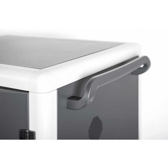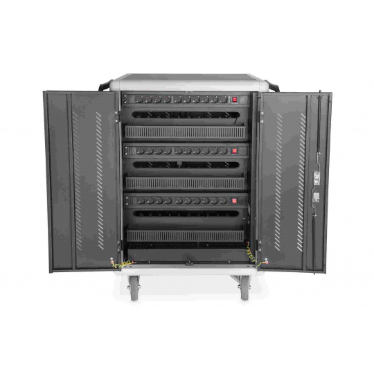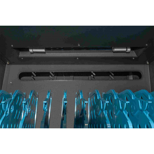Mobilní nabíjecí skříň od společnosti DIGITUS® je ideálním a kompaktním řešením pro ukládání a nabíjení přenosných zařízení, jako jsou notebooky a tablety. Mobilní nabíjecí skříňky se často používají ve veřejných zařízeních, jako jsou školy, aby bylo možné zařízení bezpečně uložit na centrálním místě a zároveň je nabíjet. Skříňka obsahuje 3 řady po 10 nabíjecích stanicích, které mají na přední straně vlastní připojení USB. Zařízení lze připojit také pomocí instalovaných zásuvkových lišt (3 x 10 bezpečnostních zásuvek) v zadní části. Díky dostatečnému množství kabelových průchodek a úložnému prostoru pro přebytečné kabely je zaručena optimální správa kabelů. Instalované ventilátory (3 x 24 V) v kombinaci s větracími štěrbinami zajišťují aktivní chlazení skříně. Instalované UV-C lampy zajišťují sterilní podmínky, a tím i šetrnost k životnímu prostředí a zvýšenou hygienu.