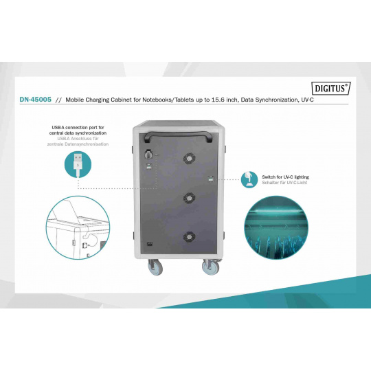 DIGITUS Mobilní nabíjecí skříňka pro notebooky/tablety do 15,6", UV-C Osvětlení-Sterilizace