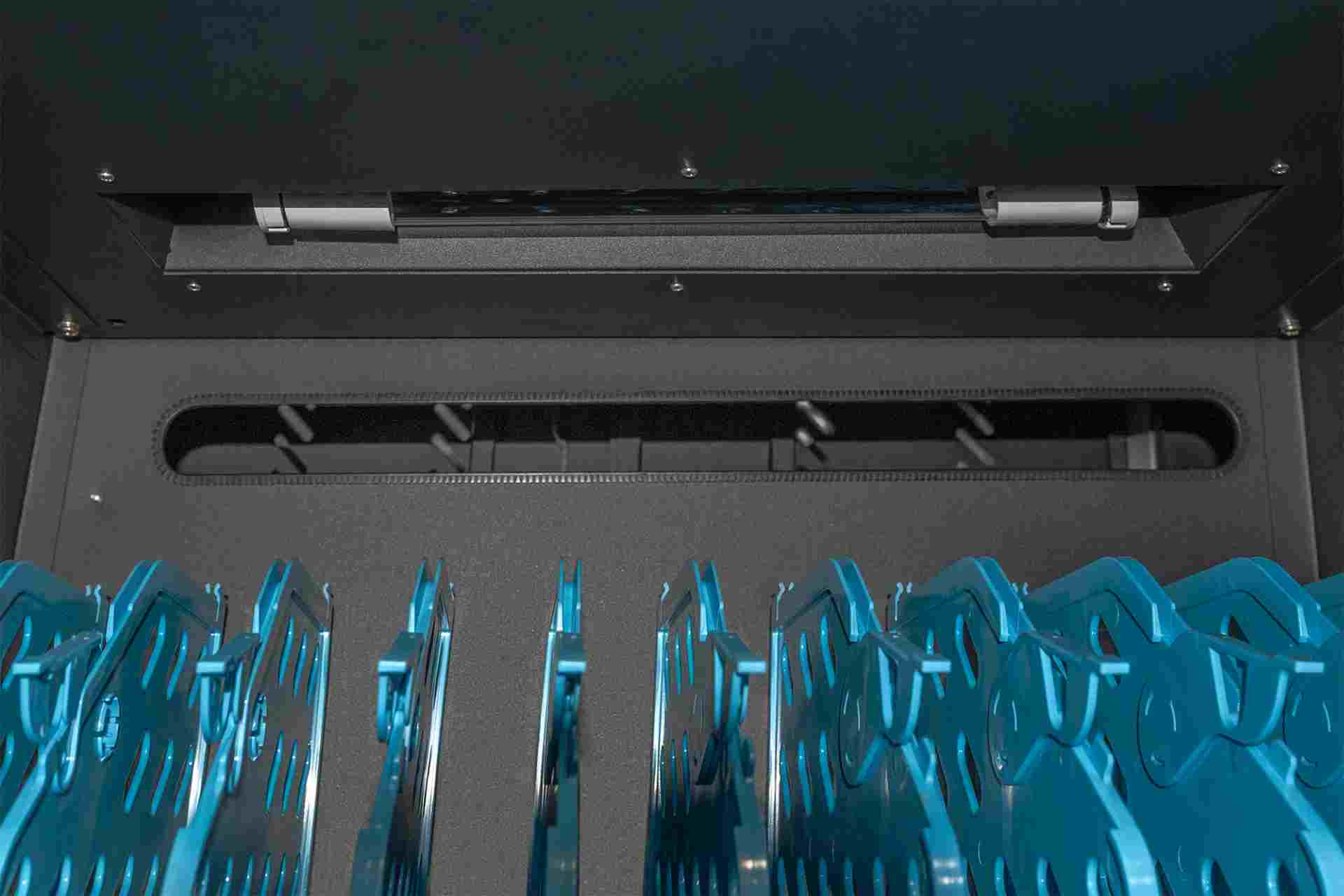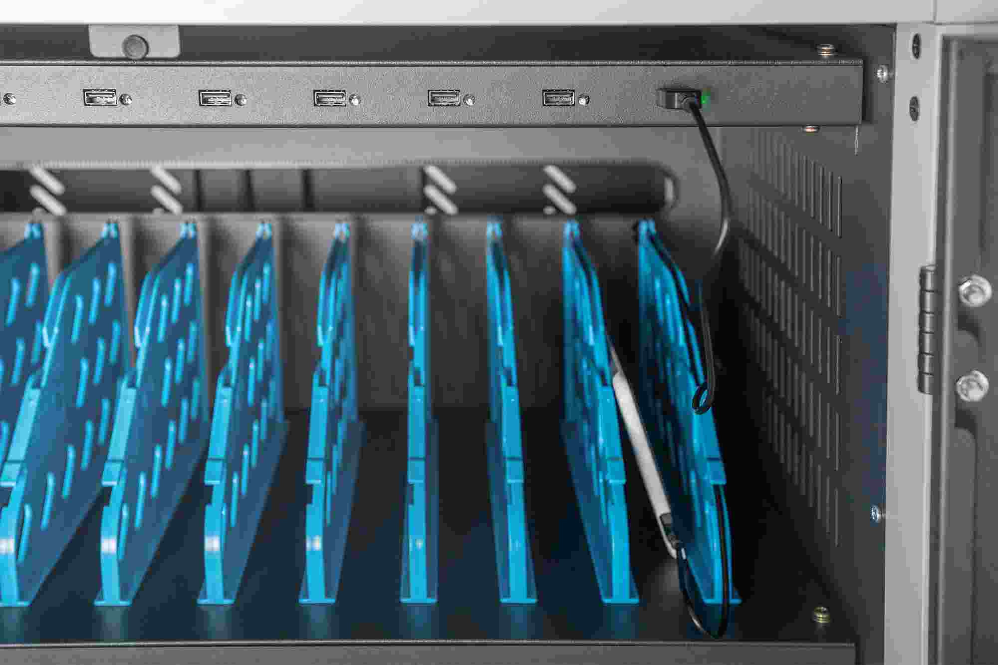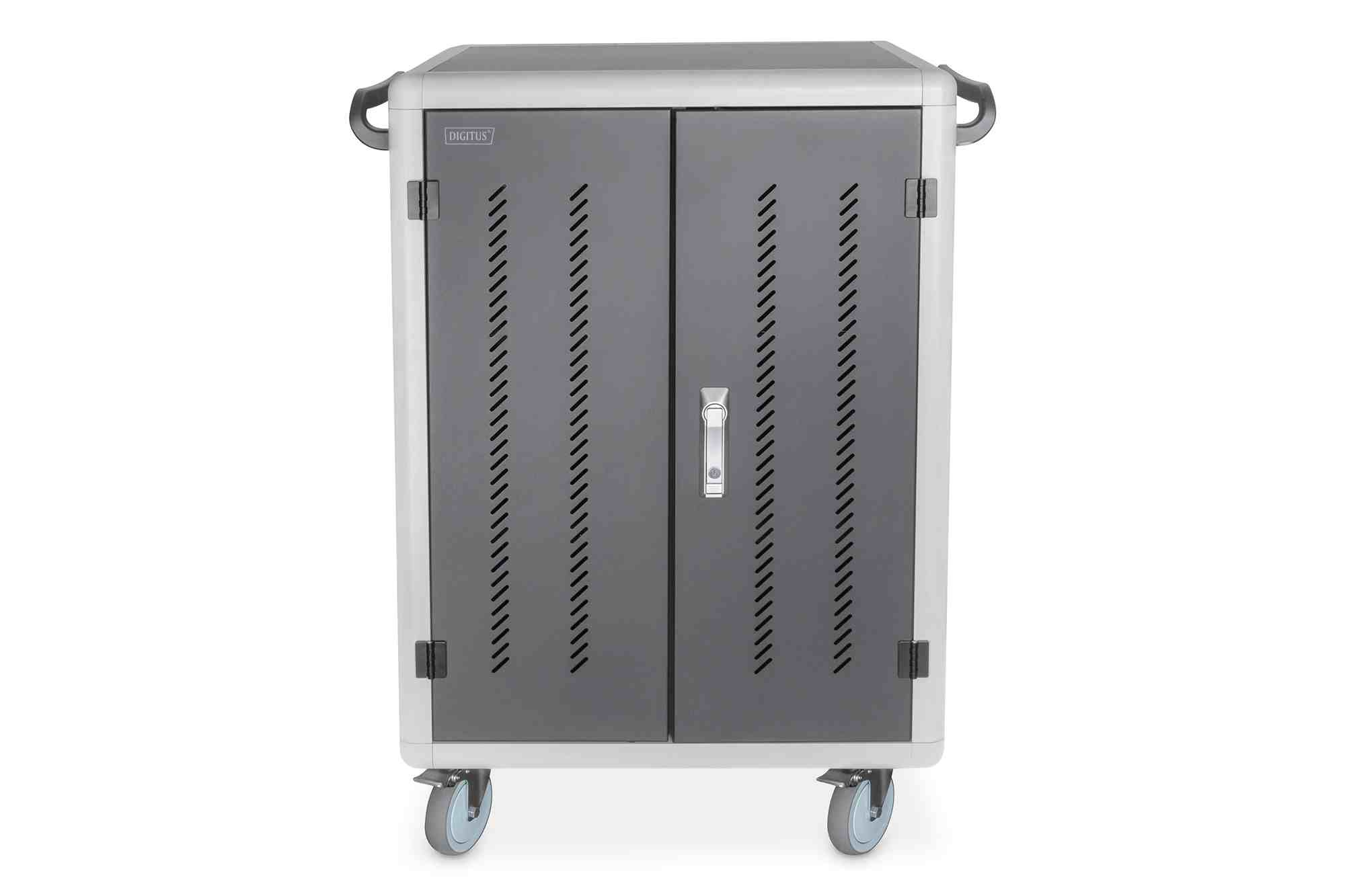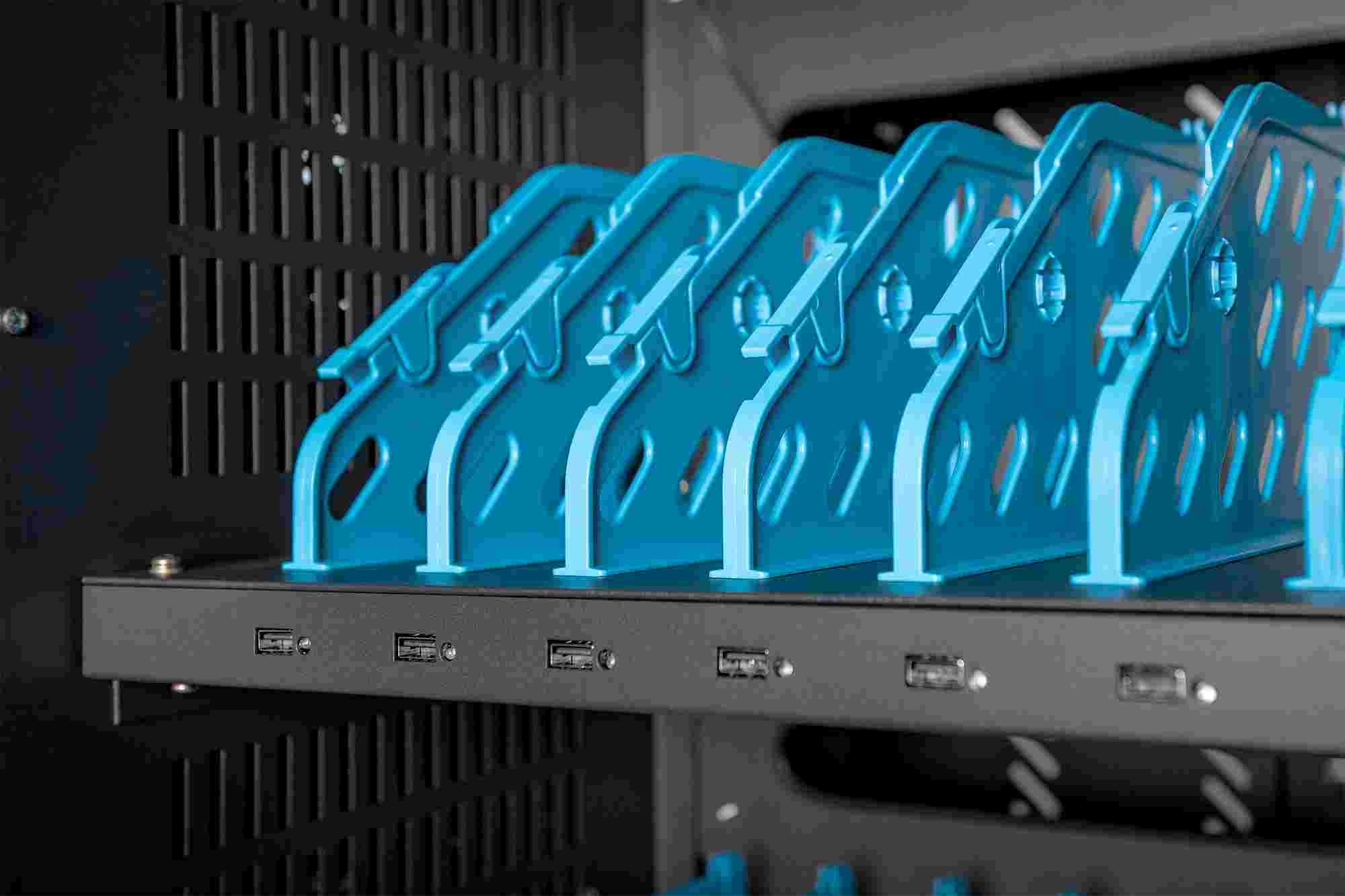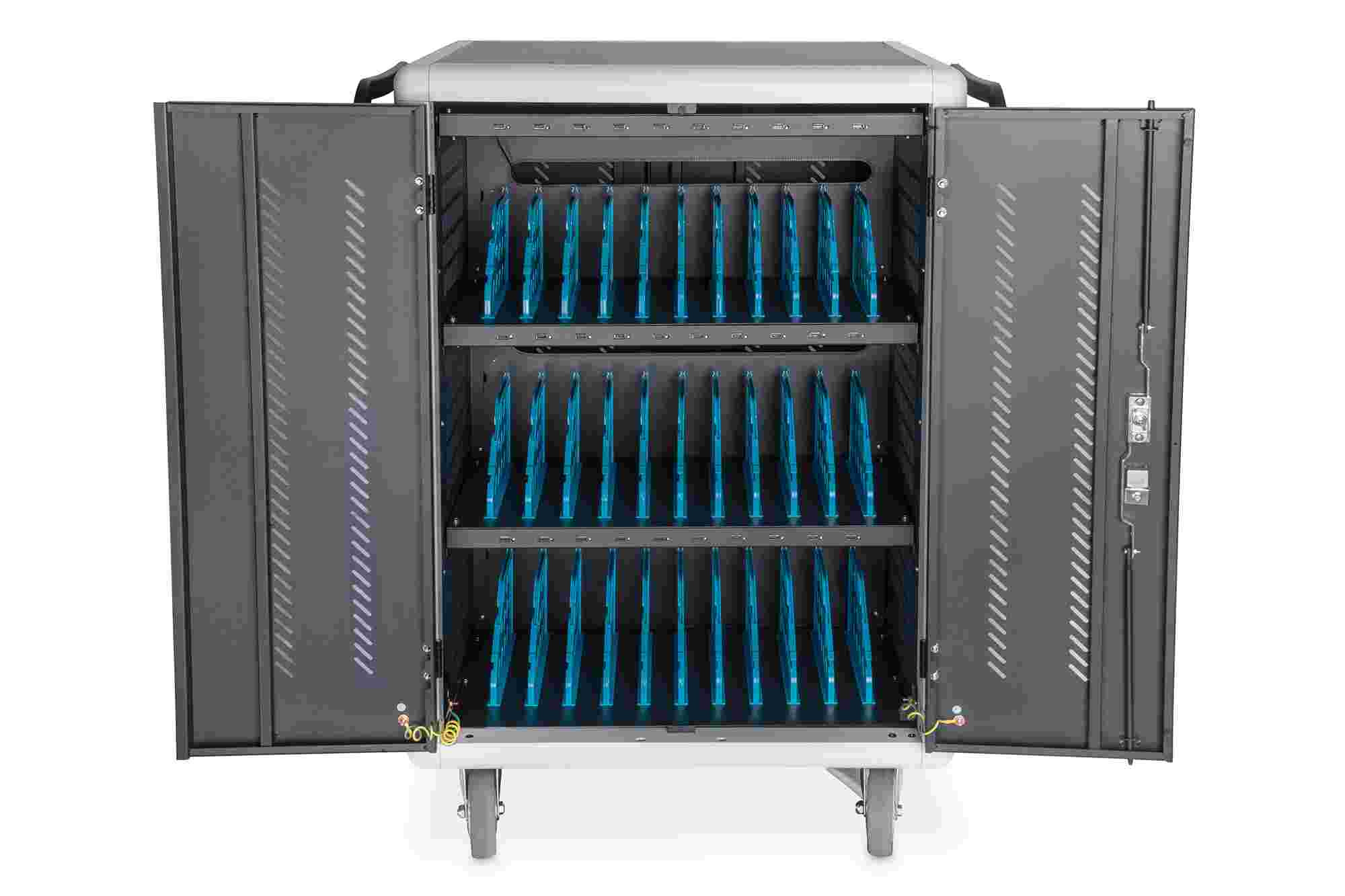 Mobilní nabíjecí skříň od společnosti DIGITUS® je ideálním a kompaktním řešením pro ukládání a nabíjení přenosných zařízení, jako jsou notebooky a tablety. Mobilní nabíjecí skříňky se často používají ve veřejných zařízeních, jako jsou školy, aby bylo možné zařízení bezpečně uložit na centrálním místě a zároveň je nabíjet. Skříňka obsahuje 3 řady po 10 nabíjecích stanicích, které mají na přední straně vlastní připojení USB. Zařízení lze připojit také pomocí instalovaných zásuvkových lišt (3 x 10 bezpečnostních zásuvek) v zadní části. Díky dostatečnému množství kabelových průchodek a úložnému prostoru pro přebytečné kabely je zaručena optimální správa kabelů. Instalované ventilátory (3 x 24 V) v kombinaci s větracími štěrbinami zajišťují aktivní chlazení skříně. Instalované UV-C lampy zajišťují sterilní podmínky, a tím i šetrnost k životnímu prostředí a zvýšenou hygienu.
