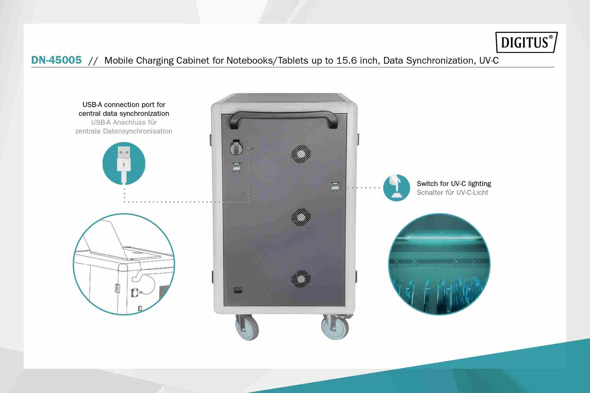 DIGITUS Mobilní nabíjecí skříňka pro notebooky/tablety do 15,6", UV-C Osvětlení-Sterilizace