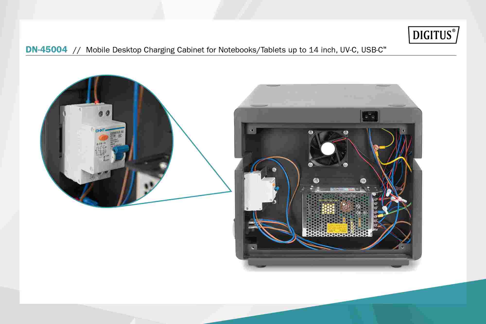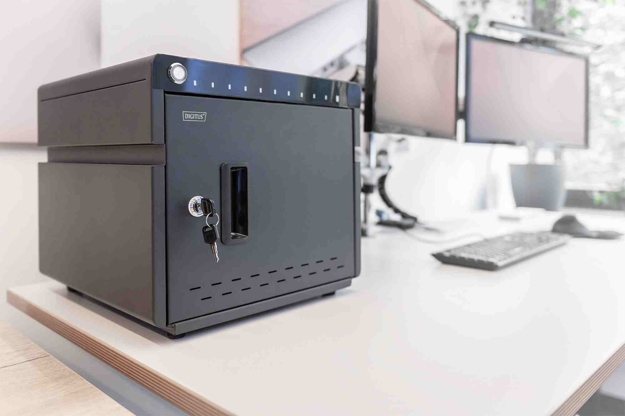 Mobilní nabíjecí skříň od společnosti DIGITUS® je ideálním a kompaktním řešením pro ukládání a nabíjení přenosných zařízení, jako jsou notebooky a tablety. Mobilní nabíjecí skříňky se často používají ve veřejných zařízeních, jako jsou školy, aby bylo možné zařízení bezpečně uložit na centrálním místě a zároveň je nabíjet. Skříňka obsahuje 10 nabíjecích stanic, z nichž všechny mají na přední straně vlastní přípojku USB. Díky integrovaným LED indikátorům máte neustále přehled o průběhu nabíjení (červená: probíhá nabíjení; zelená: nabíjení dokončeno/není připojeno žádné zařízení). Podstavce odolné proti opotřebení zajišťují neklouzavou konstrukci. Instalované ventilátory v kombinaci s větracími štěrbinami zajišťují aktivní chlazení skříně. Instalované UV-C lampy zajišťují sterilní podmínky, a tím i šetrnost k životnímu prostředí a zvýšenou hygienu.