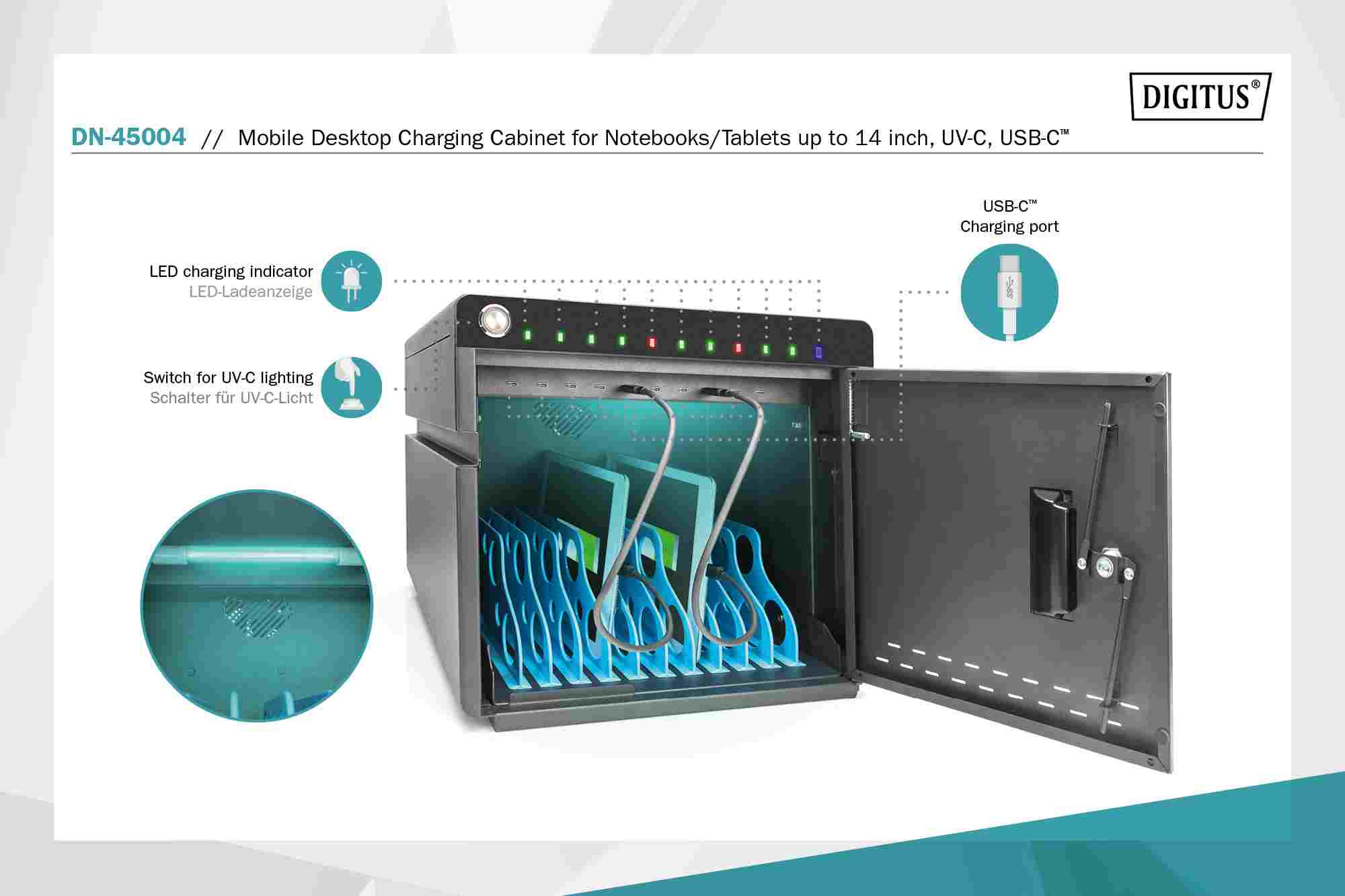 DIGITUS mobilní stolní nabíjecí skříňka pro tablety do 14 palců, 10 zařízení. UV-C, USB-C ( až 20W na zařízení)