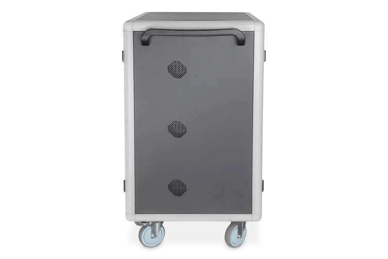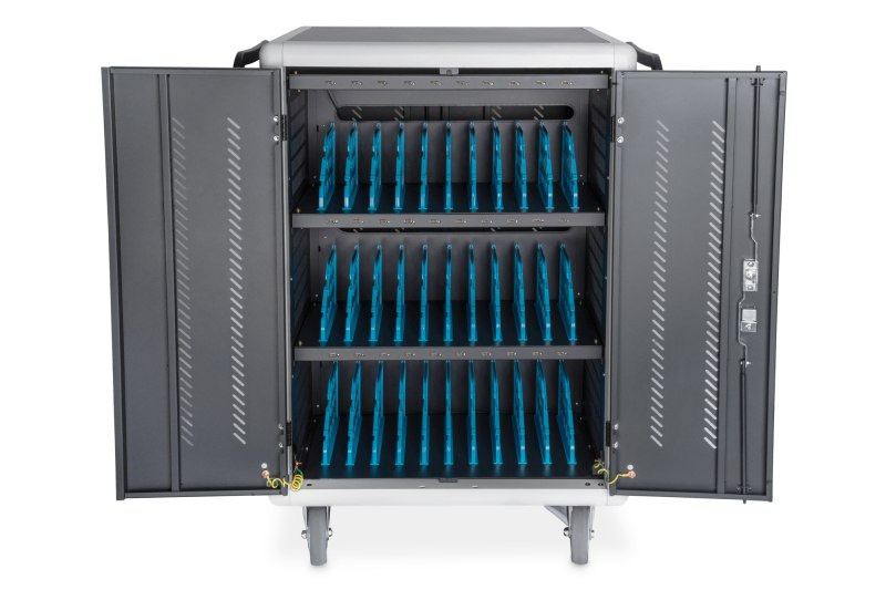Mobilní nabíjecí skříň od DIGITUS® je ideálním a kompaktním řešením pro ukládání a nabíjení vašich přenosných zařízení, jako jsou notebooky a tablety. Mobilní nabíjecí skříně se často používají ve veřejných zařízeních, jako jsou školy, aby bylo možné bezpečně uložit zařízení na centrálním místě a zároveň je nabíjet. Skříň obsahuje 3 řady s 10 nabíjecími stanicemi, z nichž všechny mají na přední straně vlastní USB připojení. Zařízení lze také připojit pomocí instalovaných zásuvkových lišt (3 x 10 bezpečnostních zásuvek) vzadu. Díky velkým kabelovým průchodkám a nadměrnému uložení kabelů je zaručeno optimální vedení kabelů. Instalované ventilátory (3 x 24 V) kombinované s ventilačními štěrbinami zajišťují aktivní chlazení skříně.