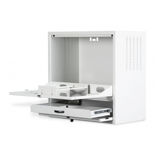IT skříňka má dva uzamykatelné přihrádky: jeden pro PC a monitor (přední dveře s tabulí z bezpečnostního skla) a druhý oddíl s výsuvnou policí pro myš a klávesnici