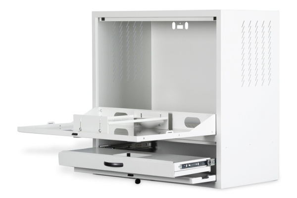 IT skříňka má dva uzamykatelné přihrádky: jeden pro PC a monitor (přední dveře s tabulí z bezpečnostního skla) a druhý oddíl s výsuvnou policí pro myš a klávesnici