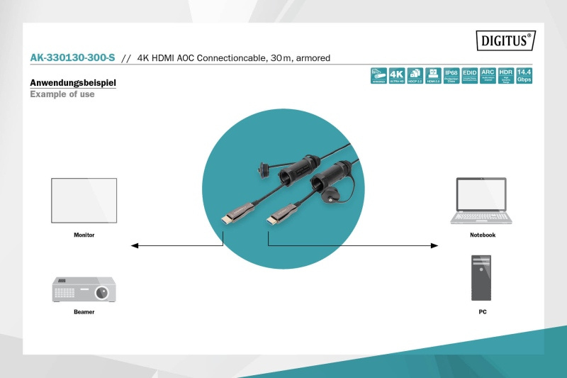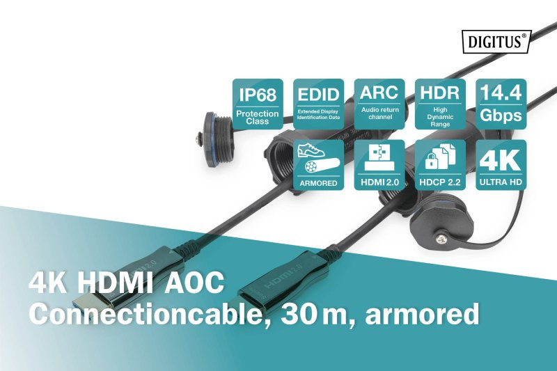 DIGITUS Připojovací kabel 4K HDMI AOC, ochranný kryt pro zástrčky IP 68; 30 m, 4K*2K@60HZ