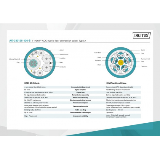 Aktivní kabel HDMI s technologií AOC je založen na hybridní konstrukci s měděným a optickým kabelem, která umožňuje šířku pásma až 18 Gbit / s s plným spektrem signálu HDMI
