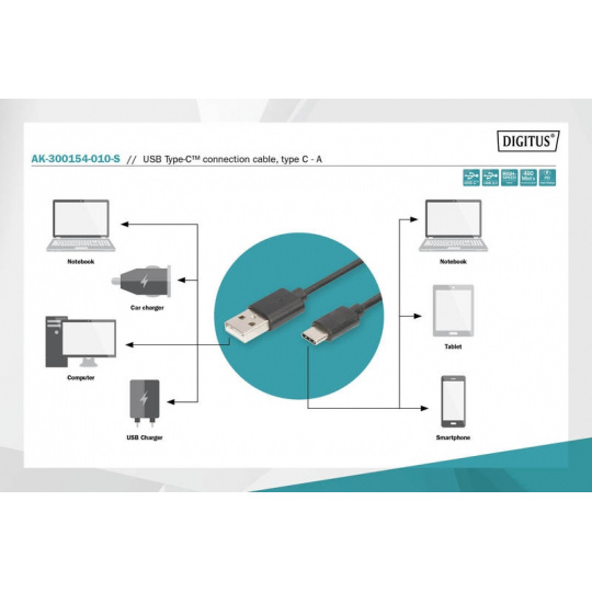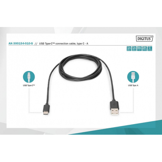 Digitus Připojovací kabel USB C na A 1,0 m, 3A, 480 MB, verze 2.0