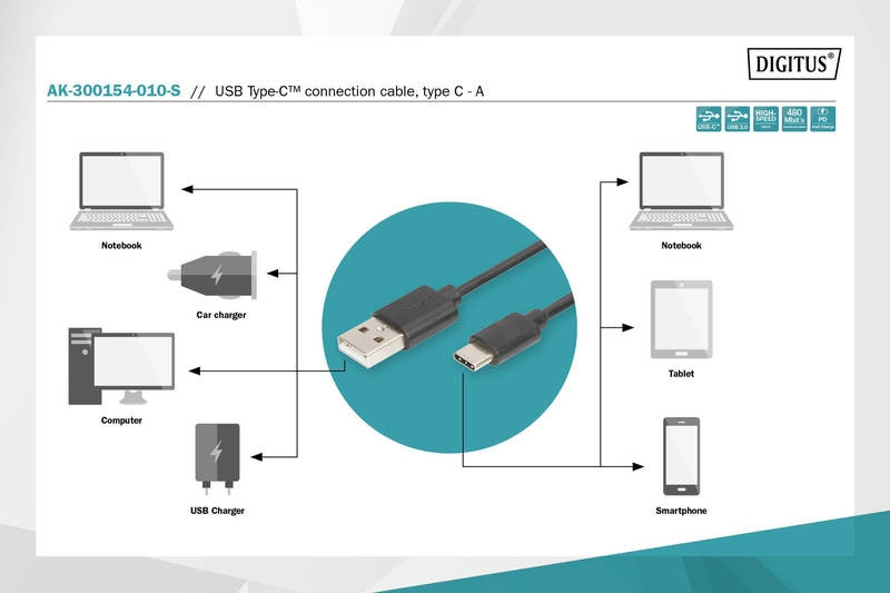 Pro připojení externích zařízení USB (s konektorem C, např. Tablet, Notebook nebo Smartphone) k hostiteli USB (např. PC nebo Notebook). Rychlost přenosu dat až 480 Mbps (vysokorychlostní).