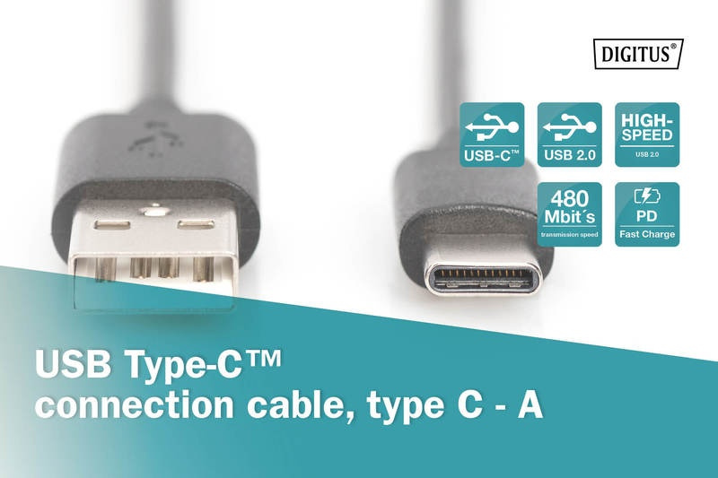 Digitus Připojovací kabel USB C na A 1,0 m, 3A, 480 MB, verze 2.0