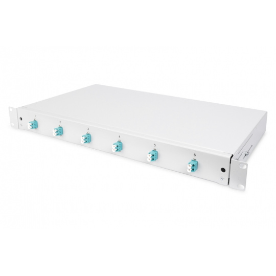 FO splice box, 1U, equipped, 6x LC DX, OM3 incl. splice cassette, colored pigtails, couplers