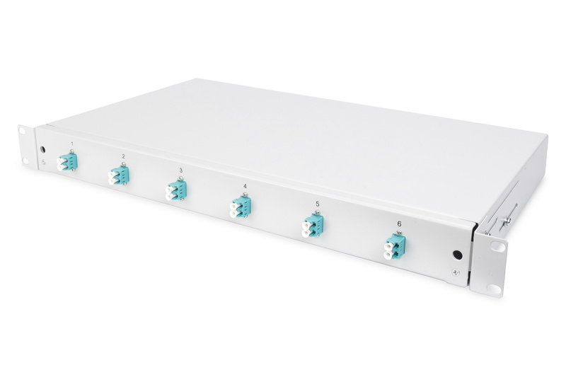 FO splice box, 1U, equipped, 6x LC DX, OM3 incl. splice cassette, colored pigtails, couplers