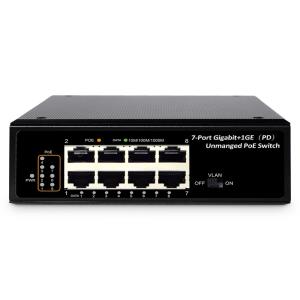 Průmyslový 7portový gigabitový PoE+přepínač+1 PD-port IEEE802.3af/at, DIN lišta, rozšířený teplotní rozsah 240W PoE budget