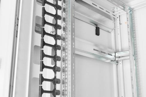 Velkoryse dimenzované vertikální kabelové kanály s vedením kabelů a krytem zabudovaným do čelního panelu