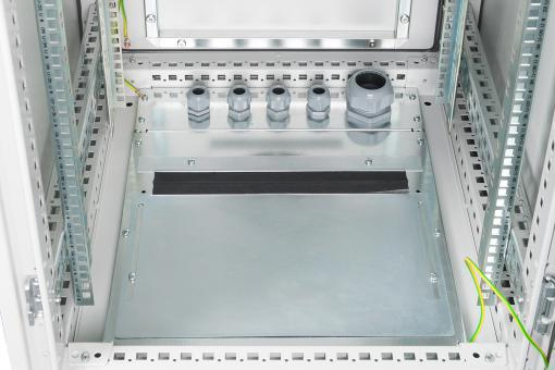 Průmyslové skříně 483 mm (19 ") jsou chráněny proti vniknutí prachu a vody v souladu s bezpečnostní úrovní IP55 (IEC EN 60529), aby poskytovaly optimalizované podmínky pro uživatelsky přívětivou instalaci aktivních a pasivních součástí sítě doprovázených úhledným vedením kabelů v barva je tvořena 70-90 µm silným práškovým nátěrem v barvě šedé (RAL 7035) se schopností přilnavosti podle EN ISO 2409: třída 0 až 1. Další provedená 500 hodinová zkouška odolnosti vůči postřiku solí potvrzuje možný rozsah provozních teplot od -25 ° C do +70 ° C. Vnitřní montážní profilové lišty 483 mm (19 ”) (dva páry = 4 kusy) jsou galvanicky pozinkovány a označeny výškovými jednotkami (počítatelné z obou směrů). jsou variabilní v hloubce a jsou spojeny s přídavnými podpůrnými tyčemi pro realizaci rozsáhlých instalací zařízení o délce 483 mm (19 ”). Dále je uvnitř konstrukce otočného profilu. Každá skříň je vybavena soklem (výška 100 mm), který nabízí additio prostor pro kabeláž. Základna každé skříňky je vybavena posuvným kabelovým vstupním panelem s gumovým těsněním a pěti kabelovými vstupy PG (4x PG21 + 1x PG48). Rozsáhlé portfolio příslušenství pro správu kabelů, police atd. Pomůže splnit mnoho požadavků při každodenním používání.