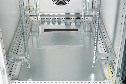Průmyslové skříně 483 mm (19 ") jsou chráněny proti vniknutí prachu a vody v souladu s bezpečnostní úrovní IP55 (IEC EN 60529), aby poskytovaly optimalizované podmínky pro uživatelsky přívětivou instalaci aktivních a pasivních součástí sítě doprovázených úhledným vedením kabelů v barva je tvořena 70-90 µm silným práškovým nátěrem v barvě šedé (RAL 7035) se schopností přilnavosti podle EN ISO 2409: třída 0 až 1. Další provedená 500 hodinová zkouška odolnosti vůči postřiku solí potvrzuje možný rozsah provozních teplot od -25 ° C do +70 ° C. Vnitřní montážní profilové lišty 483 mm (19 ”) (dva páry = 4 kusy) jsou galvanicky pozinkovány a označeny výškovými jednotkami (počítatelné z obou směrů). jsou variabilní v hloubce a jsou spojeny s přídavnými podpůrnými tyčemi pro realizaci rozsáhlých instalací zařízení o délce 483 mm (19 ”). Dále je uvnitř konstrukce otočného profilu. Každá skříň je vybavena soklem (výška 100 mm), který nabízí additio prostor pro kabeláž. Základna každé skříňky je vybavena posuvným kabelovým vstupním panelem s gumovým těsněním a pěti kabelovými vstupy PG (4x PG21 + 1x PG48). Rozsáhlé portfolio příslušenství pro správu kabelů, police atd. Pomůže splnit mnoho požadavků při každodenním používání.