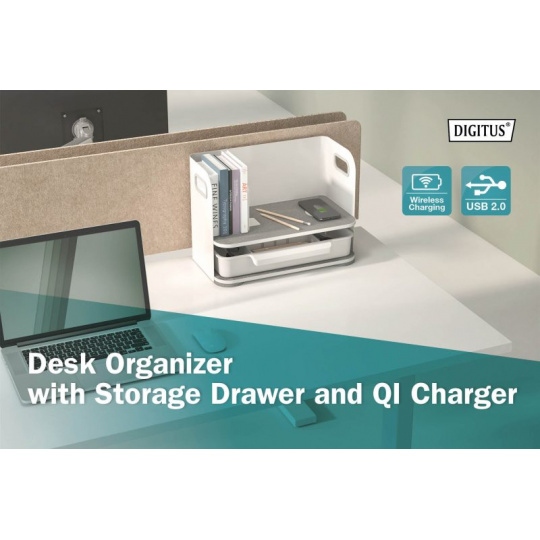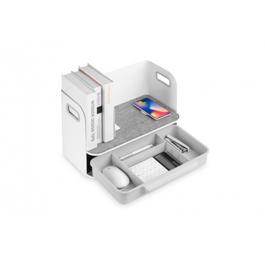 DIGITUS Stolní organizér s úložnou zásuvkou + nabíječka QI bílá/šedá