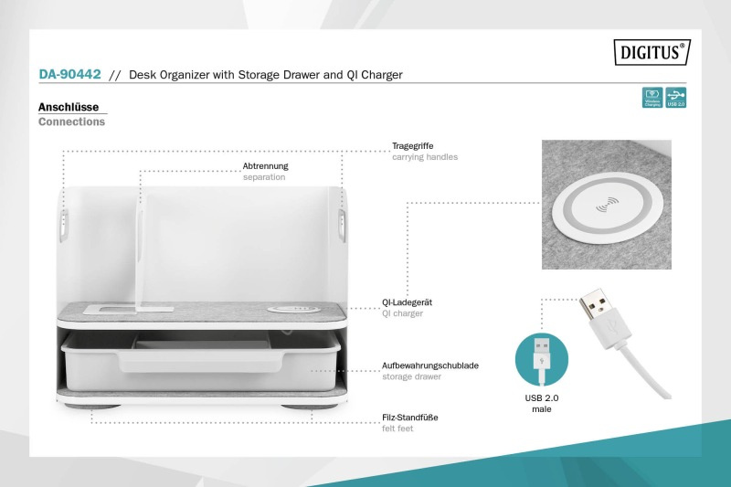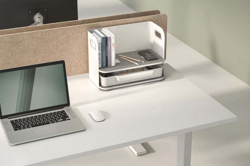 Praktický a stylový organizér na pracovní stůl s nabíječkou Qi zajišťuje pořádek na pracovišti. Nabízí také nabíječku Qi pro chytré telefony. Kromě elegantního designu nabízí praktický úložný prostor pro dokumenty, knihy apod. a také zásuvku, jejíž členění lze přizpůsobit. Úložné prostory jsou opatřeny stylovým plstěným povrchem.