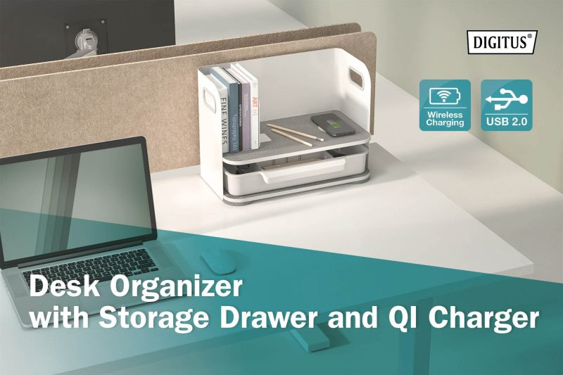 DIGITUS Stolní organizér s úložnou zásuvkou + nabíječka QI bílá/šedá